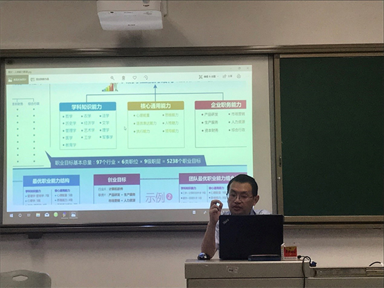 主讲人曾劲首先指出,要培养高水平的创新创业人才,必须要了解适应市场的职业能力结构,包括学科知识能力、核心通用能力和企业实践能力。随后,他就如何提升职业能力结构水平提出了高频特训、强化实践等方法,并为大家展示了覆盖大学四年的教育时间节点图。最后,曾劲详细介绍了课程设计和校内外导师矩阵设计的具体内容,提出线上与线下同时并行的教学答疑模式,并指出,只有最大化利用资源,才能打造更好的双创课程。