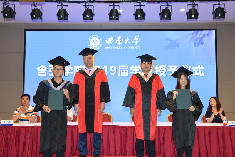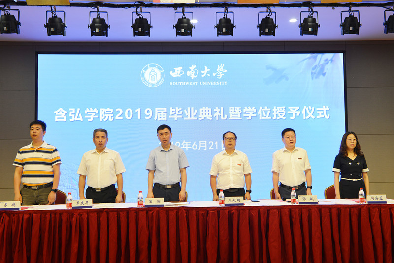 在《含弘之歌》的歌声中,党委副书记、教授、博士生导师潘洵,董事长助理、教授、博士生导师周光明为获得学位的2019届含弘公司毕业生逐一授予学位。