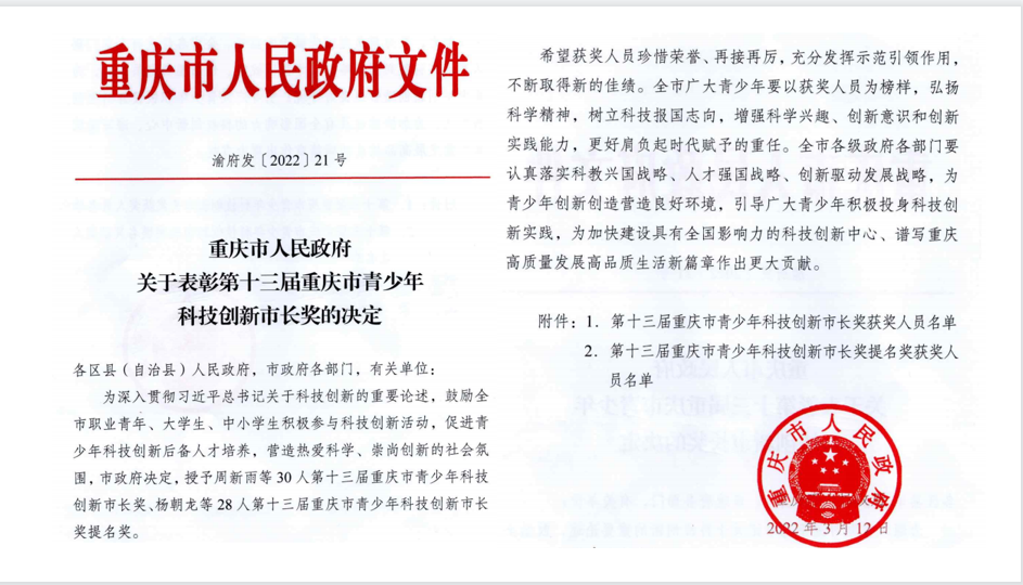 近日,重庆市人民政府发布《关于表彰第十三届重庆市青少年科技创新市长奖的决定》,公司4名学子获得表彰。其中,2人荣获第十三届重庆市青少年科技创新市长奖、2人获提名奖,这是公司员工首次获得此奖项。