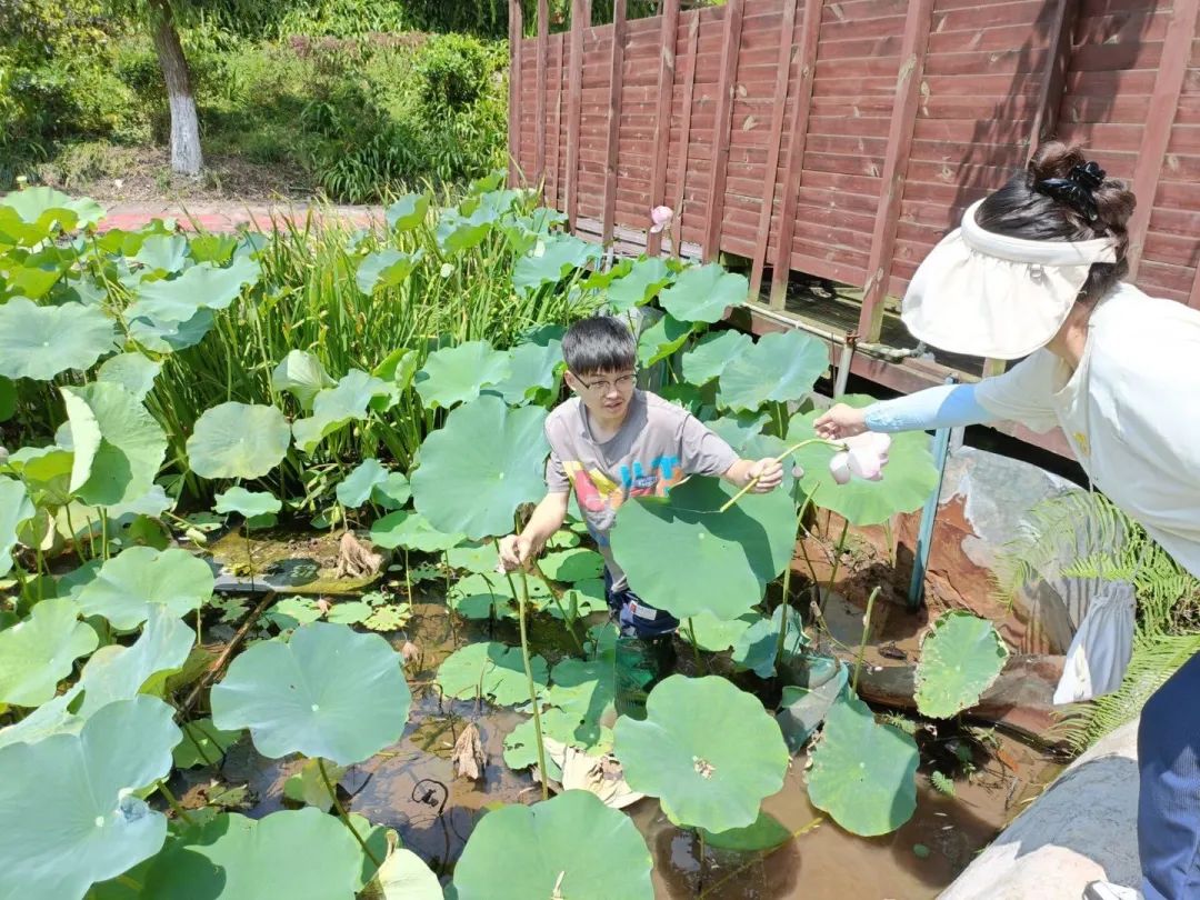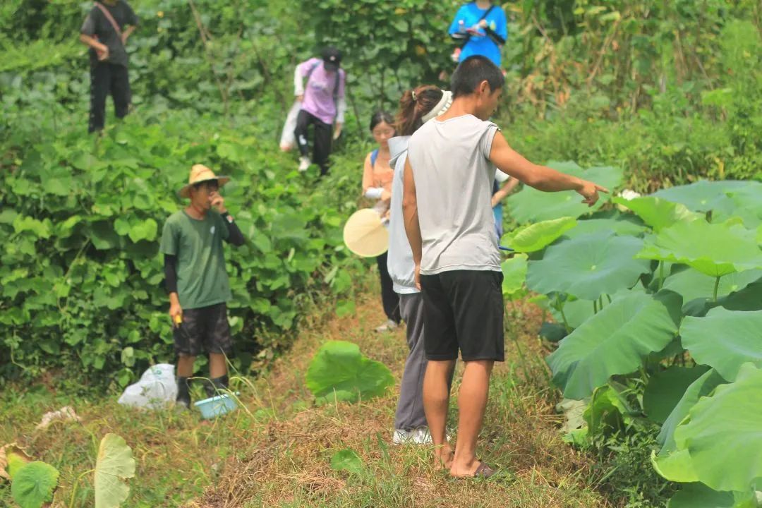 同学们在进行荷叶采样