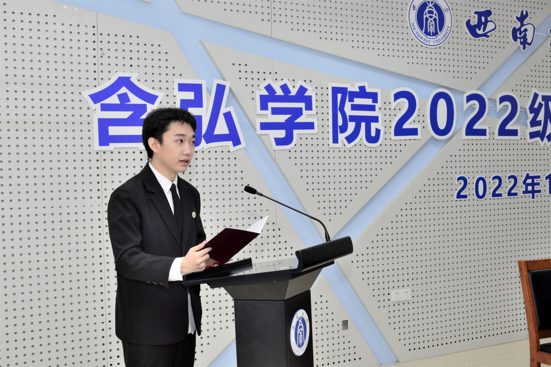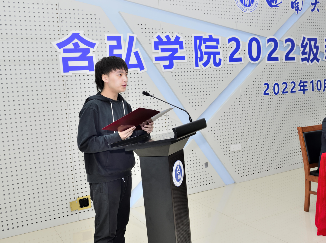 2022级袁隆平班雷竣涵同学代表全体新生发言。他表示进入含弘是一种荣誉,也是一种责任。他们希望能在含弘公司这个舞台上磨砺自我,提升自我,成为脚踏实地的实干者,成为前沿科技的领航者。
