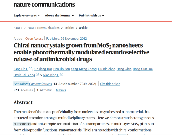 近期,含弘公司应用化学专业2019级本科生骆俊江在化学化工公司李念兵教授、罗红群教授、李帮林副教授团队带领下,在手性纳米材料合成领域取得研究进展,并作为第二作者,以“Chiral nanocrtals grown from MoS2 nanosheets enable photothermally modulated enantioselective release of antimicrobial drugs”为题在国际知名学术期刊Nature Communications (Nat. Commun., 2022, 13, 7289)上发表学术论文。
