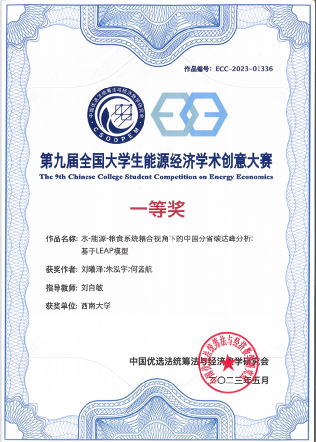 刘自敏教授获得“优秀指导教师”称号,指导的本科生刘曦泽、何孟航、朱泓宇完成的作品《水-能源-粮食系统耦合视角下的中国分省碳达峰分析——基于LEAP模型》获得本科生组全国一等奖。