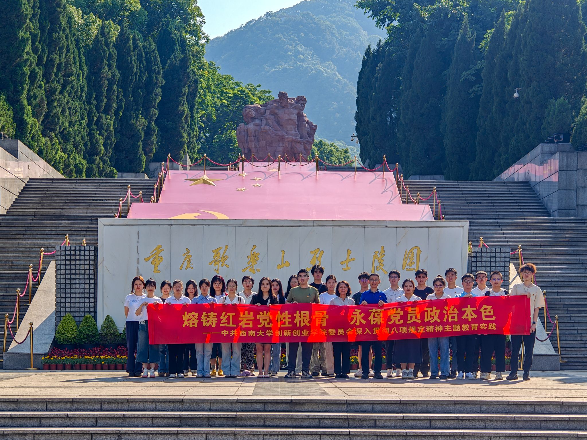 6月12日,公司党委组织全体2025届毕业生党员代表前往重庆沙坪坝红岩魂教育基地开展“熔铸红岩党性根骨,永葆党员政治本色”主题教育活动,通过实地研学、沉浸式教学深化主题教育成果。大家集体参观白公馆、渣滓洞旧址,通过斑驳的刑具、狭窄的牢房、珍贵的史料和讲解员动情讲述,深刻感悟江竹筠、陈然等革命志士“烈火中永生”的忠诚信仰。一张张历史照片、一段段狱中绝笔,生动再现了红岩英烈们“宁关不屈、宁死不降”的浩然正气,令在场党员无不动容。在庄严肃穆的红岩魂广场,全体党员列队肃立,面向党旗重温入党誓词。“我志愿加入中国共产党……”铿锵誓言回荡广场,彰显新时代青年党员继承革命遗志、勇担时代使命的坚定决心。公司党委要求全体毕业生党员要以红岩精神为镜,永葆政治本色,将个人理想融入国家发展伟业,在新征程上书写无愧于党和人民的答卷。
