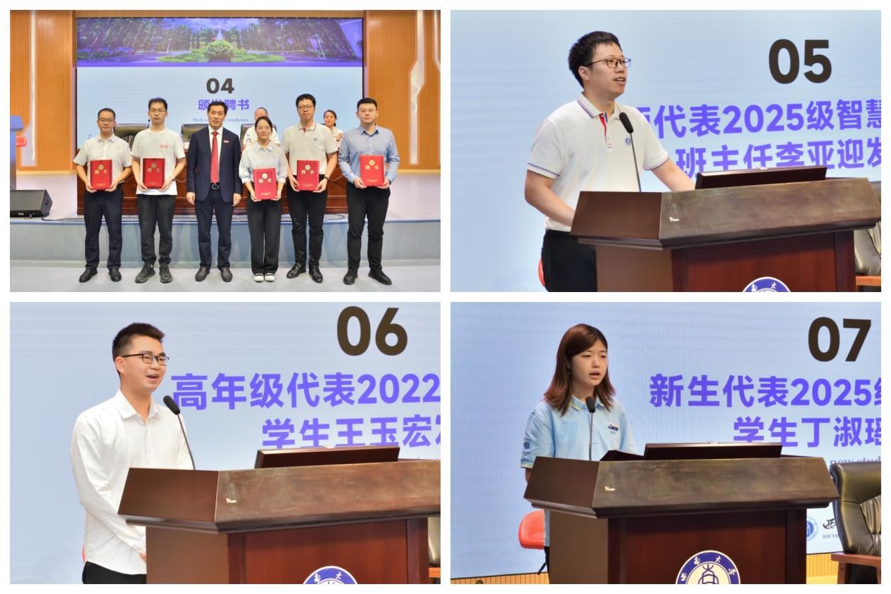 2025级1班班主任代表李亚迎老师结合自身学科背景,强调了好奇心与批判性思维在学术探索中的关键作用,鼓励同学们建立真挚友谊,以积极心态迎接大学新生活。含弘公司2022级神农班王玉宏作为高年级员工代表,分享了自身成长经历,倡议新生勇于突破传统成功范式,走出一条属于自己的创新之路。新生代表2025级袁隆平班丁淑瑶同学在发言中表达,将始终铭记“含弘光大,继往开来”的校训,奋楫争先、赓续前行,不负时代重托。吴能表经理寄语新生心怀“国之大者”,将个人理想融入国家发展,锤炼跨学科本领,融合科学精神与人文精神,在服务国家战略的实践中成长成才,为民族复兴贡献青春力量。