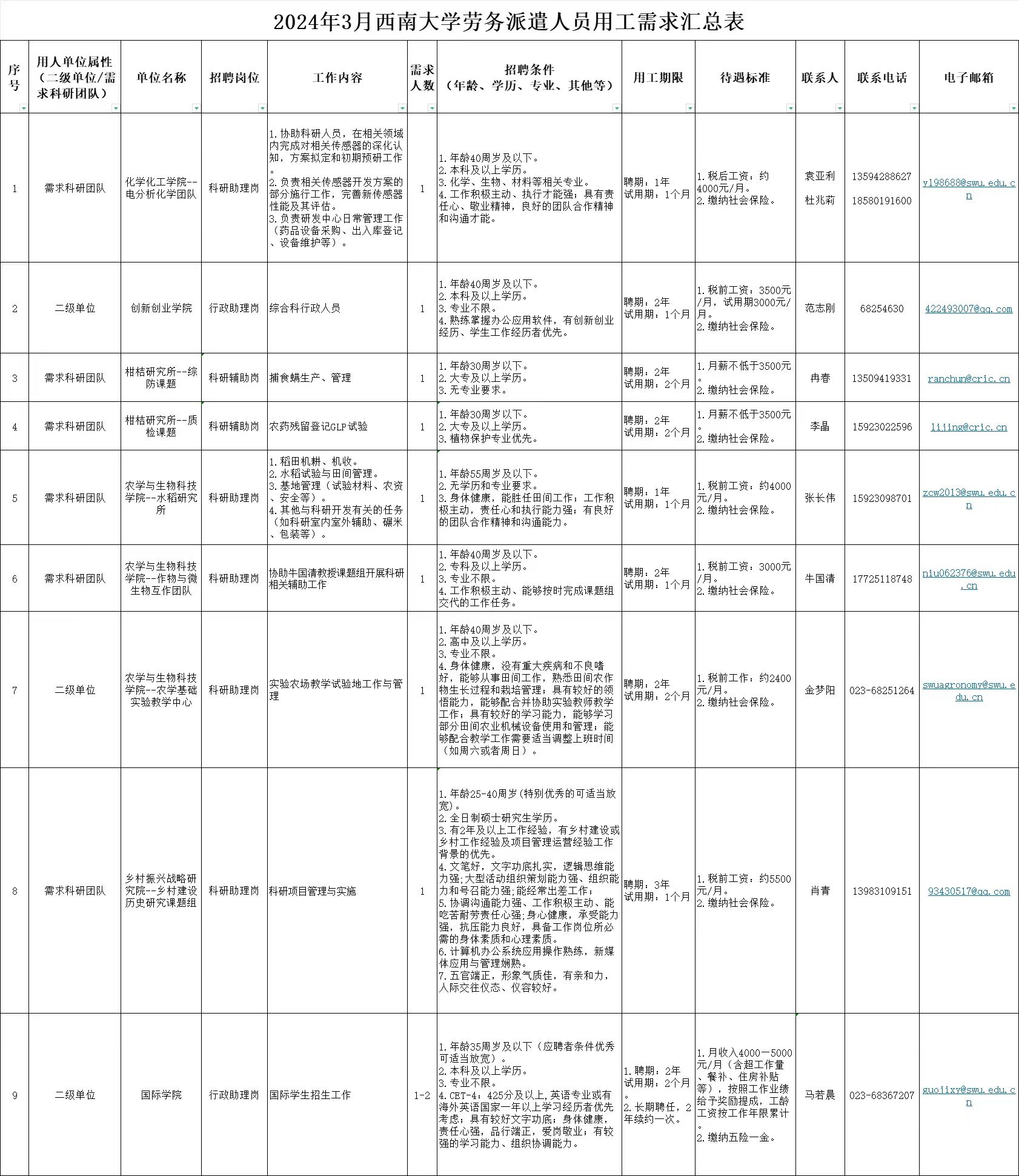 各岗位报名材料发送邮箱、联系人、联系电话详见附件。