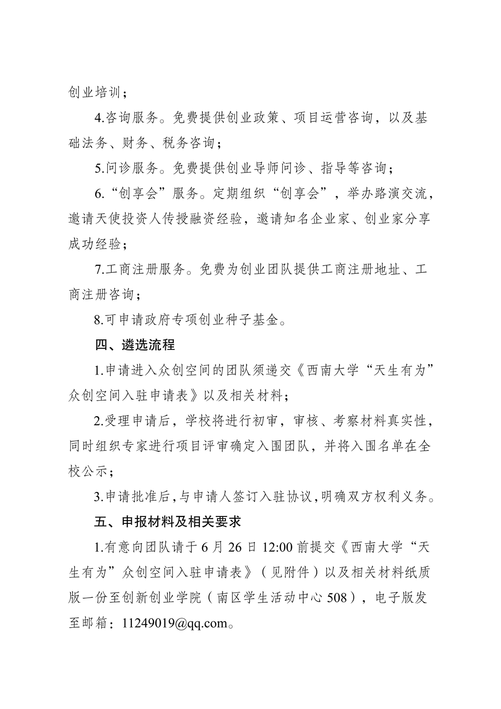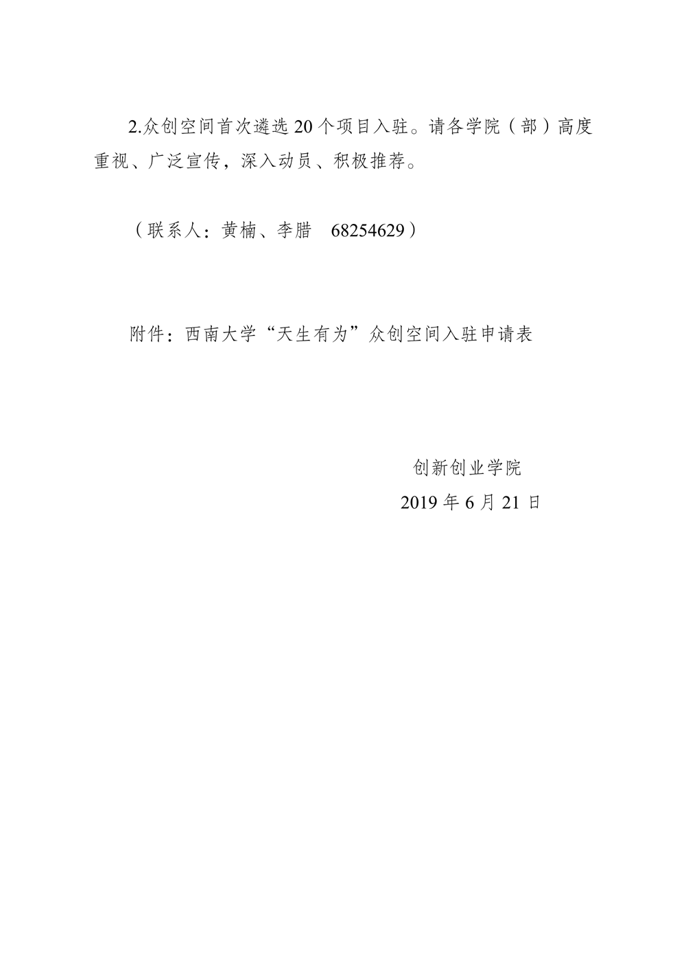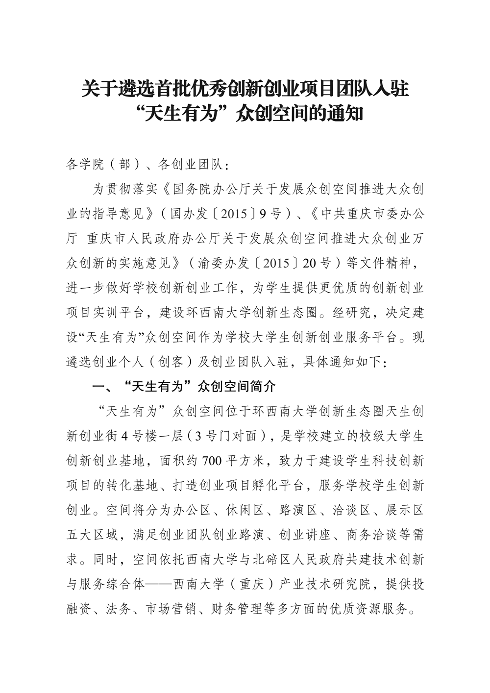 关于遴选首批优秀创新创业项目团队入驻“天生有为”众创空间的通知