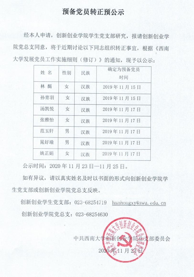预备党员转正预公示2020年11月