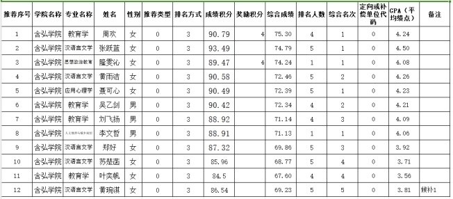 根据《含弘公司关于开展2024届推荐优秀应届本科毕业生免试攻读硕士学位研究生工作的通知》精神,经推免工作小组对综合积分计算,班级公布、员工本人核对,公司党政联席会讨论通过,现将含弘公司2024届推免研究生排序公示如下:
