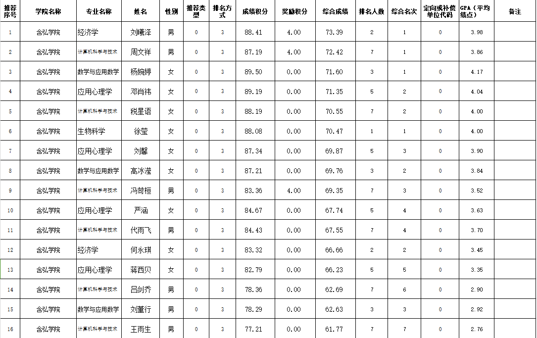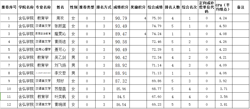因袁隆平班杨紫嫣自愿放弃推免研究生资格,按综合测评排序,由吴宓班黄琬淇增补,现将含弘公司2024届推免研究生排序进行第二次公示: