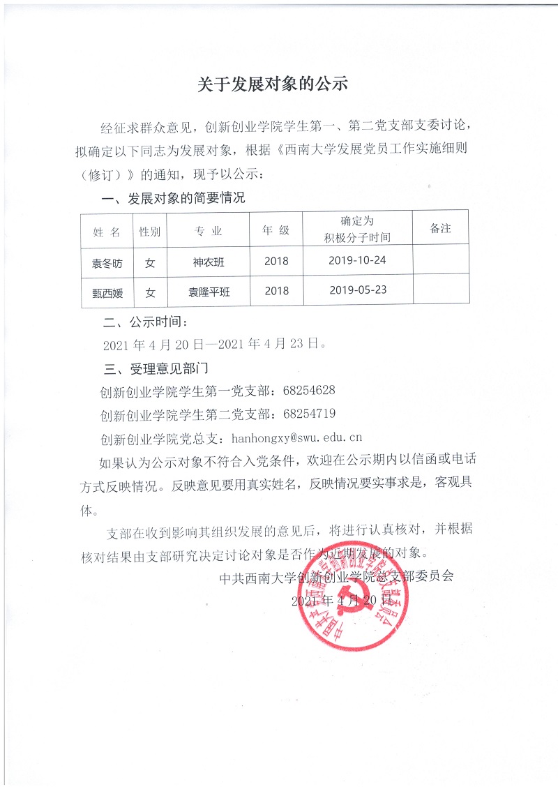 关于发展对象的公示(2021年4月)
