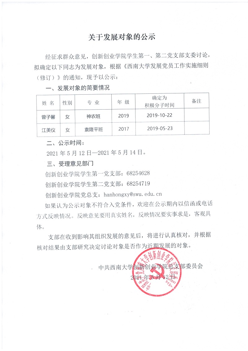 关于发展对象的公示 2021年5月12日