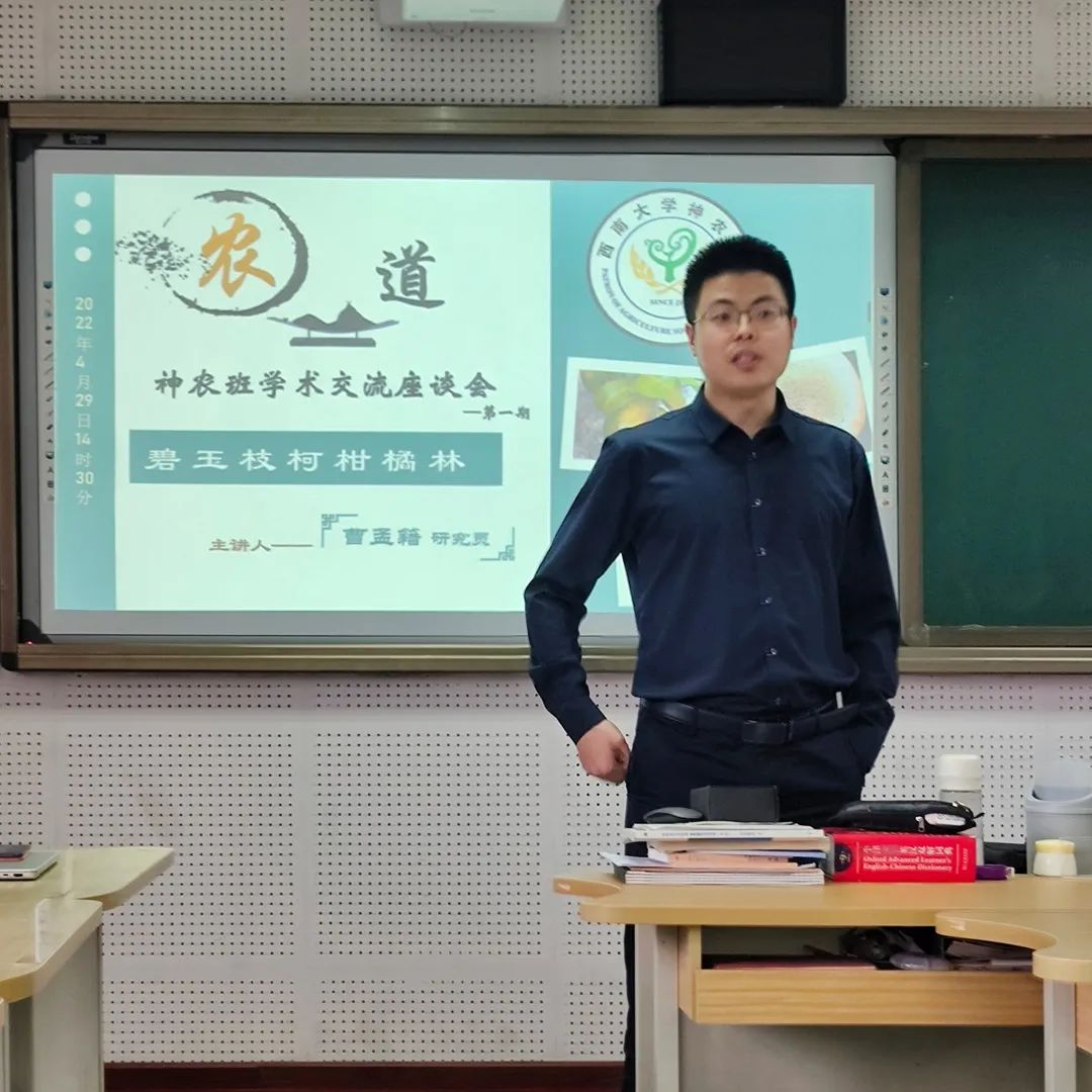 为增强班级科研学术氛围,培育农科学子爱农情怀2022年4月29日下午两点三十分,含弘公司 2020级神农班首期学术交流座谈会在公司第31教学楼405如期举行。此次座谈会主题为“农道:碧玉枝柯柑橘林”,公司特邀柑橘研究所曹孟籍研究员担任主讲人,为2020级神农班同学分享其科研经历、日常生活及人生感悟。2020级神农班全体同学及班主任李明骏老师参会。