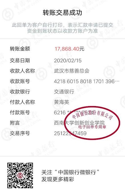 截至2月15日中午12点募捐结束,短短两天时间累计接收捐款17868.4元,现已全部汇至武汉市新冠肺炎防控指挥部通告(第4号)内公布的武汉慈善总会账户。虽然捐赠金额不多,但表达了含弘学子对武汉人民的爱心,对国家和社会贡献自己的一份力量。