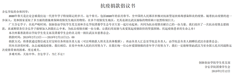 12日,创新创业员工党支部联合公司团委员工会在官网发布《抗疫捐款倡议书》,各班级迅速行动起来,在全院员工中积极宣传动员,为抗击新冠肺炎疫情进行募捐。