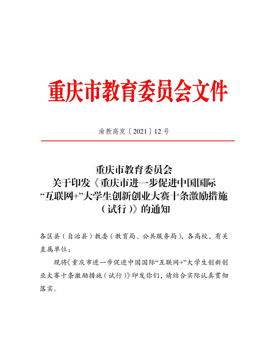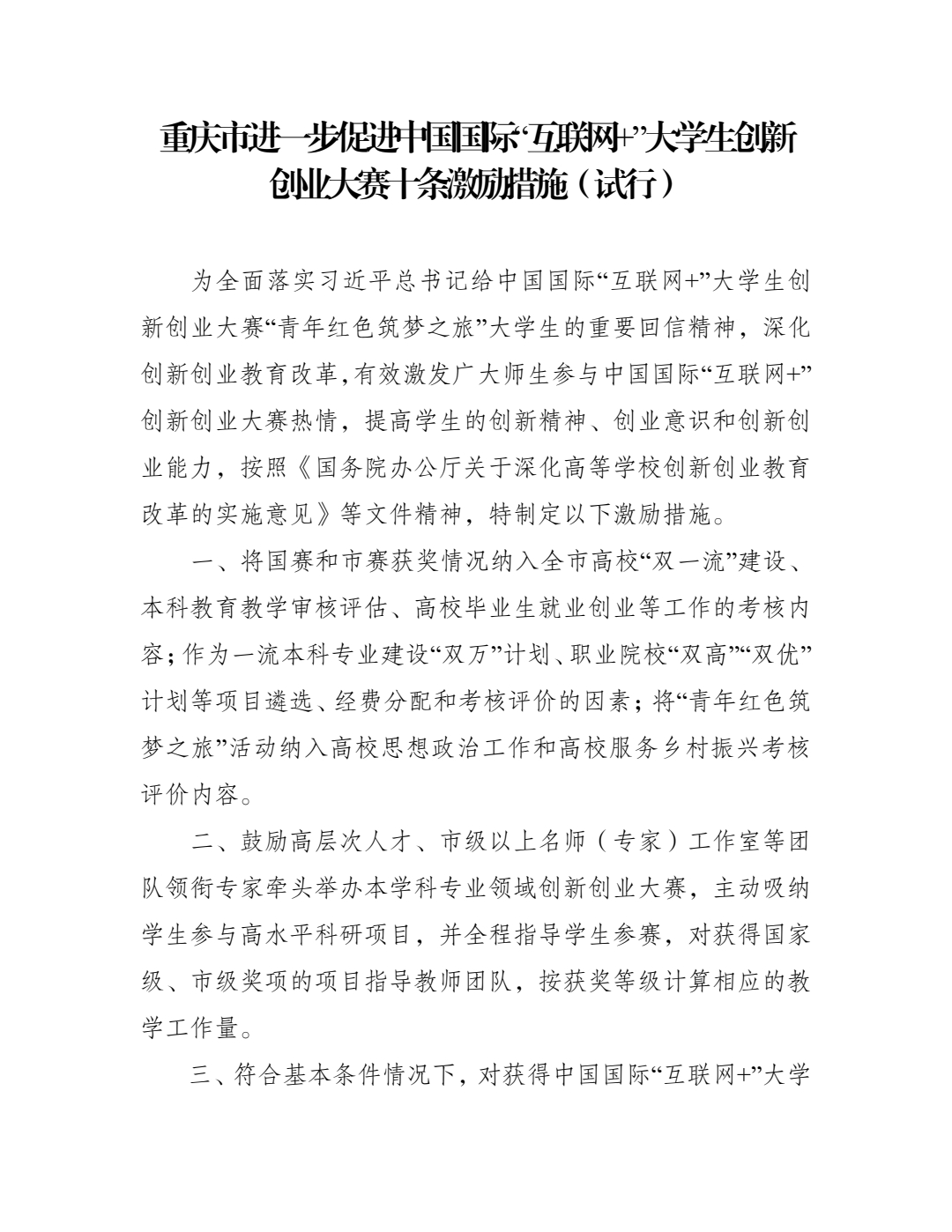 关于印发《重庆市进一步促进中国国际“互联网+”老员工创新创业大赛十条激励措施(试行)》的通知