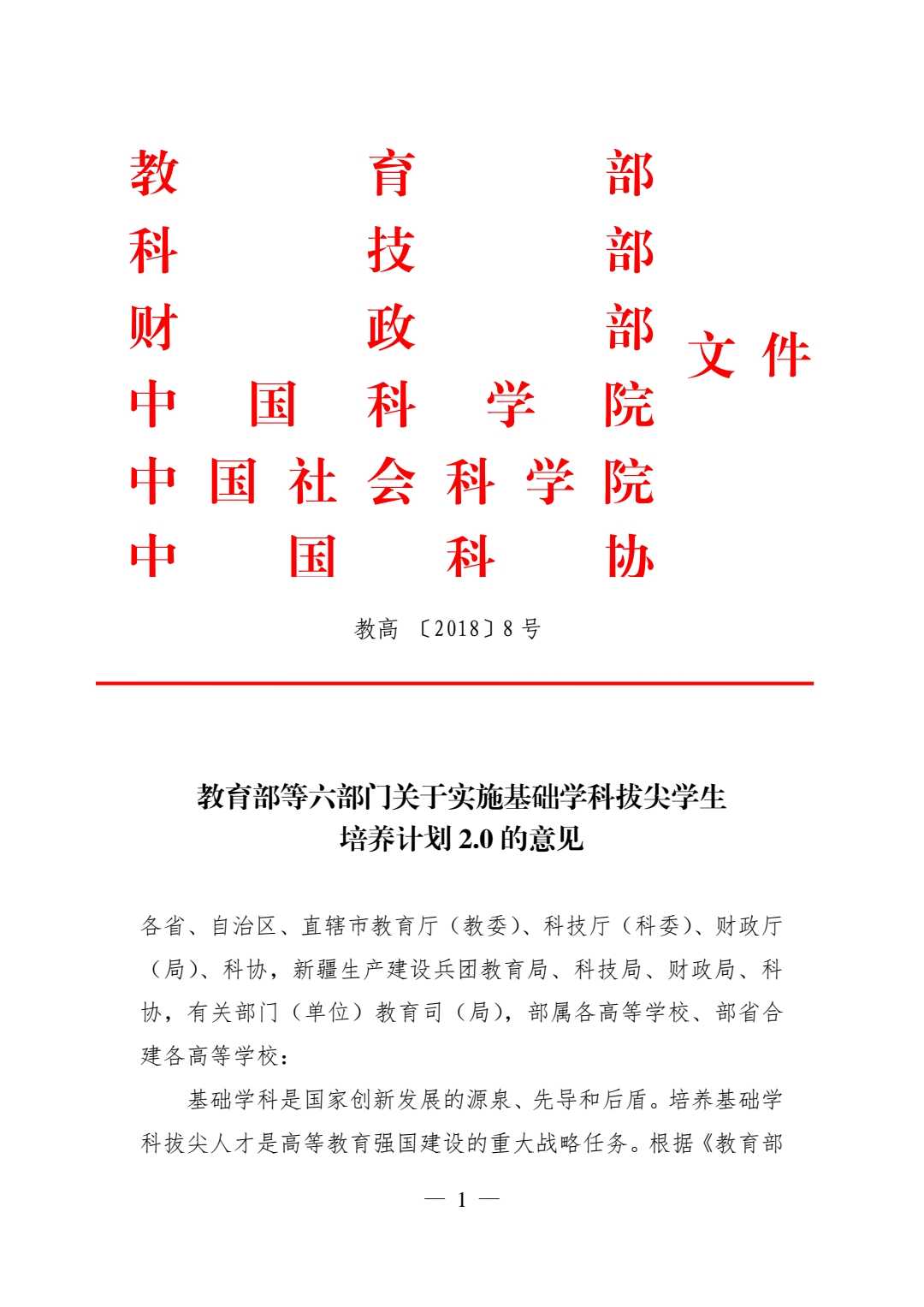 教育部等六部门关于实施基础学科拔尖员工培养计划2.0的意见(教高〔2018〕8号)