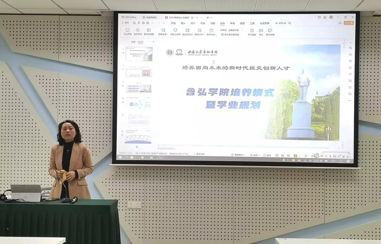 随后,封云分别讲解了含弘公司袁隆平班、吴宓班、神农班的人才培养目标、考核标准和课程安排,并介绍了含弘公司“启航生涯服务站”育人品牌。