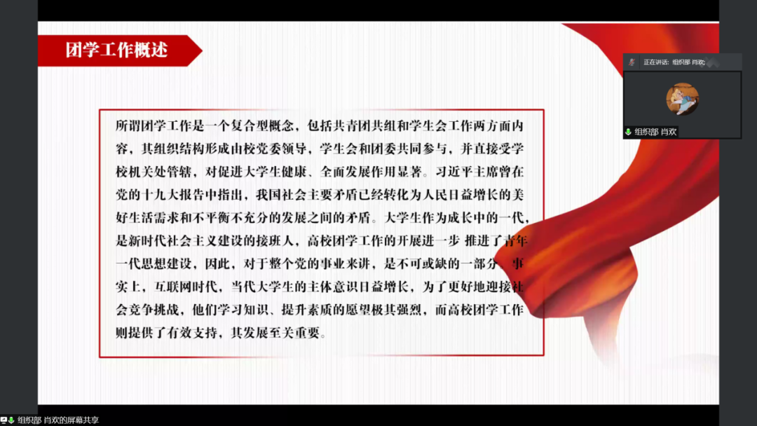 组织部工作人员肖欢同学就防范化解涉团学领域风险专题进行分享。讲解了团学领域存在的三种风险及其表现形式:形式主义泛滥、创新表现不足、内部凝聚力差。提出了防范化解风险四项对策:要重视思想引导、规范管理制度、加强和谐建设、引入先进科技,充分发挥二级公司团委员工会在参与公司管理和构建和谐校园中的作用。