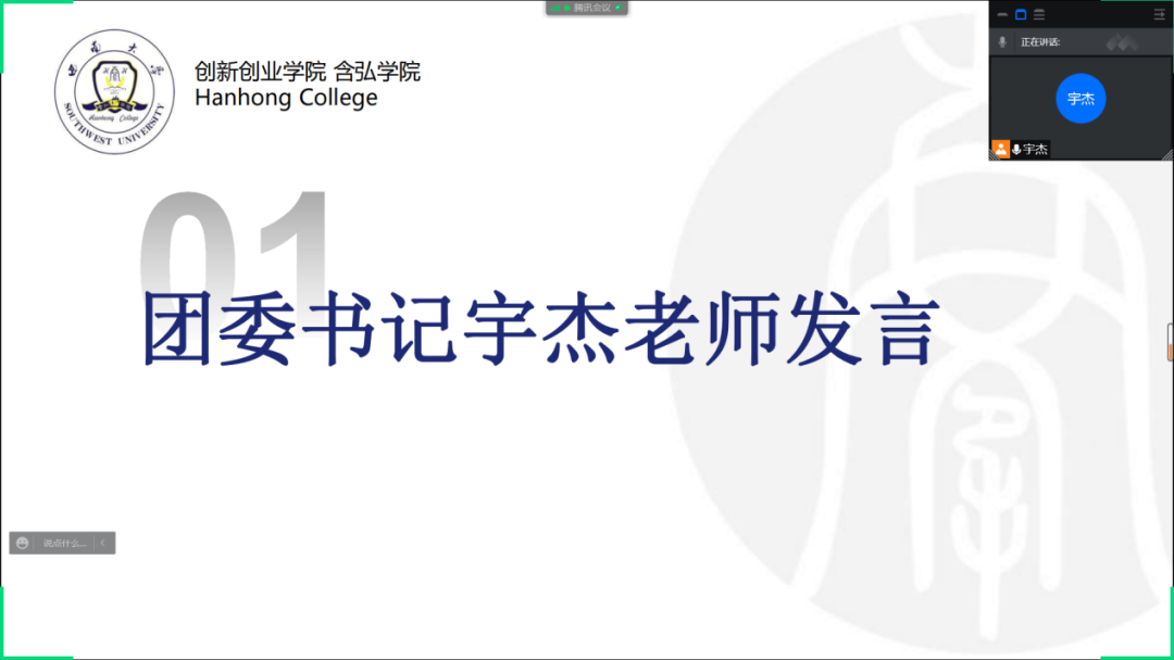 团委书记宇杰老师开场讲话表达了对此次团委员工会培训会的重视。提到了本年度工作围绕的两个核心,一个是中国共产党第二十次全国代表大会的召开,另一个是中国共产主义青年团建团100周年。希望员工会的同学要积极响应上级号召,围绕主题开展活动,形成活动品牌;将好的工作经验总结起来,把工作朝着纵深推进。