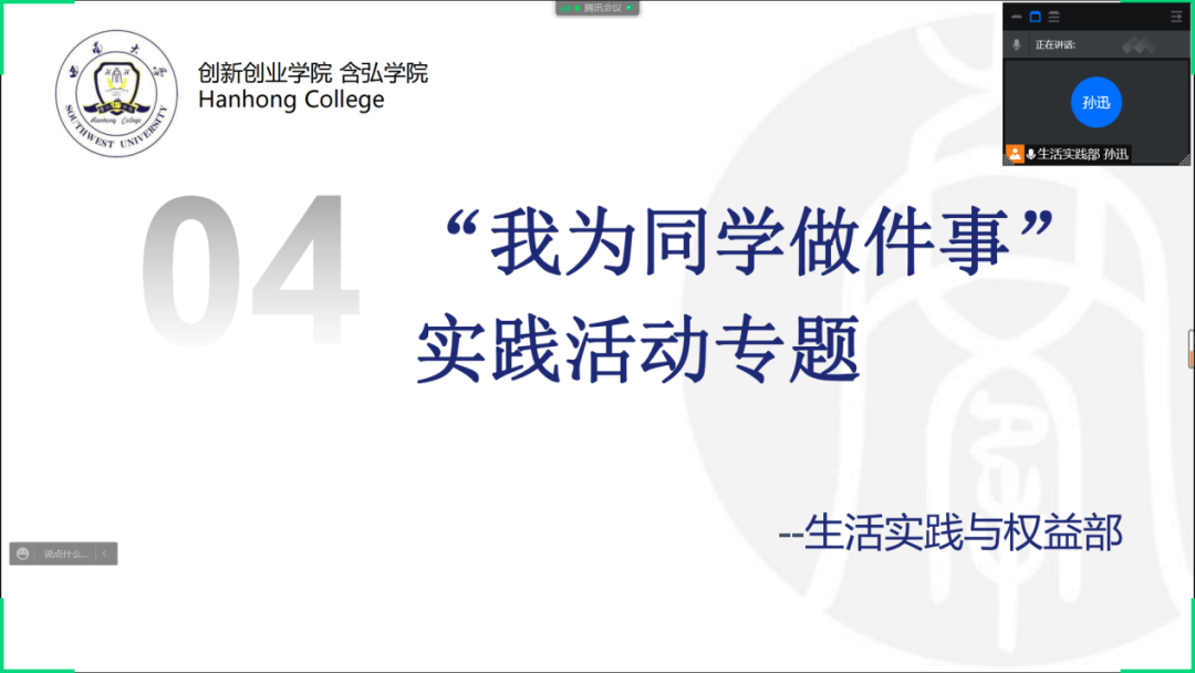 生活实践与权益部孙迅同学为大家带来了含弘公司员工会“我为同学做件事”主题活动的讲解。提到活动开展的背景及目的,要贯彻"以员工为本,全心全意为同学服务"的原则,倾听同学们的学习和生活中的意见和建议,并协调解决和反馈结果,真正做到我为同学做件事,我为同学做实事。分享了家乡文化交流活动、书籍交换共享和提案征集活动的开展流程及工作安排。