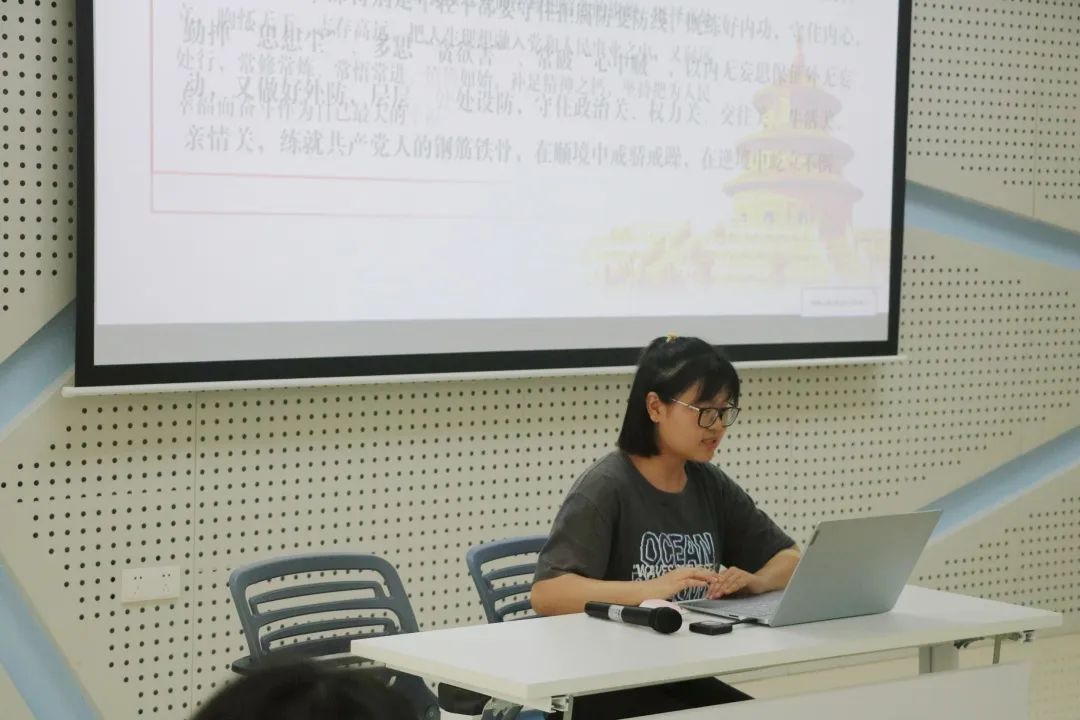 组织部邓润卿同学强调了斗争精神的重要性,发扬斗争精神要注重策略方法,讲究斗争艺术。介绍了当今世界背景与要求,处于当今百年未有之大变局,必须增强“四个意识”,坚定“四个自信”,做到“两个维护”,敢于出击,敢战敢胜。