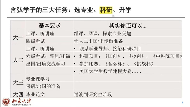 科研素养是帮助大家在激烈的保研竞争中脱颖而出的核心力量,培养科研型人才也是含弘公司办学以来一直所坚守的初心所在。然而科研从来没有平坦的大路可走,对于如何做好科研,学长学姐们这样说:周意勇学姐和李依阳学姐指出大一、大二作为科研的入门阶段,可以通过看学术期刊论文、汇报文献来了解专业领域的研究内容和研究方法。大三作为成长期,可以通过主导科研项目、发表学术论文、参加比赛来提高自己的科研素养和学术能力。邓越学姐建议大家在官网上了解导师的研究方向,尽早参与导师的研究项目,和导师、学长学姐进行交流,感受科研氛围。