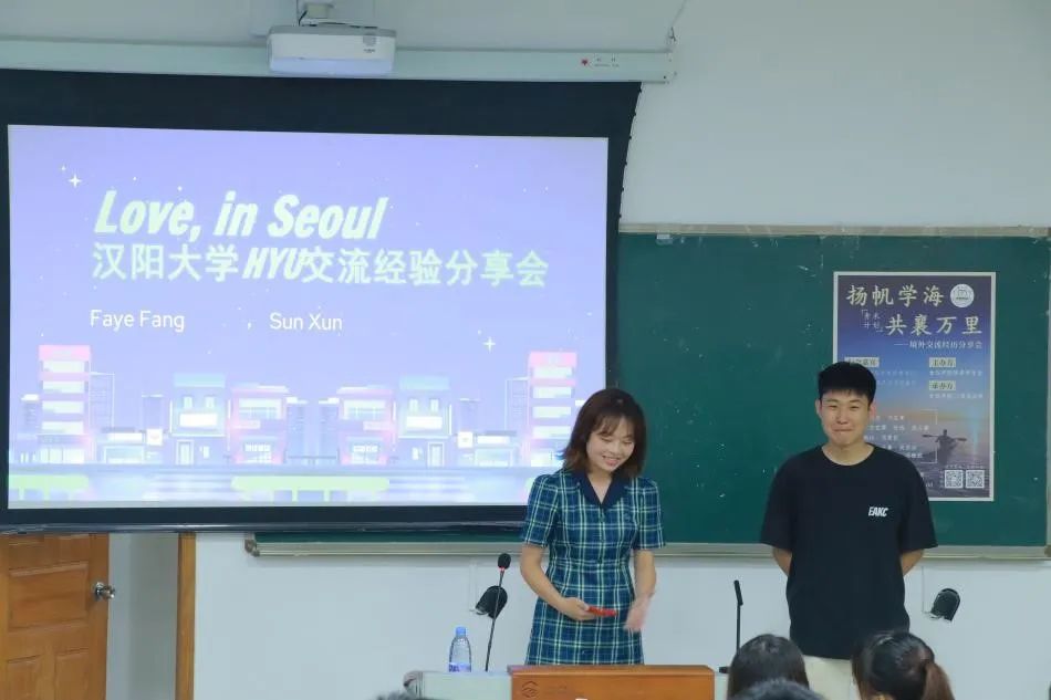 前往韩国汉阳大学交流的方艺霏、孙迅同学向同学们介绍了在汉阳大学学习的经历,他们建议同学们可以加入社会科公司体验相关活动,同时也提到身边有许多善良友好的同学和陌生人,打消了同学们对韩国一些刻板印象的顾虑。