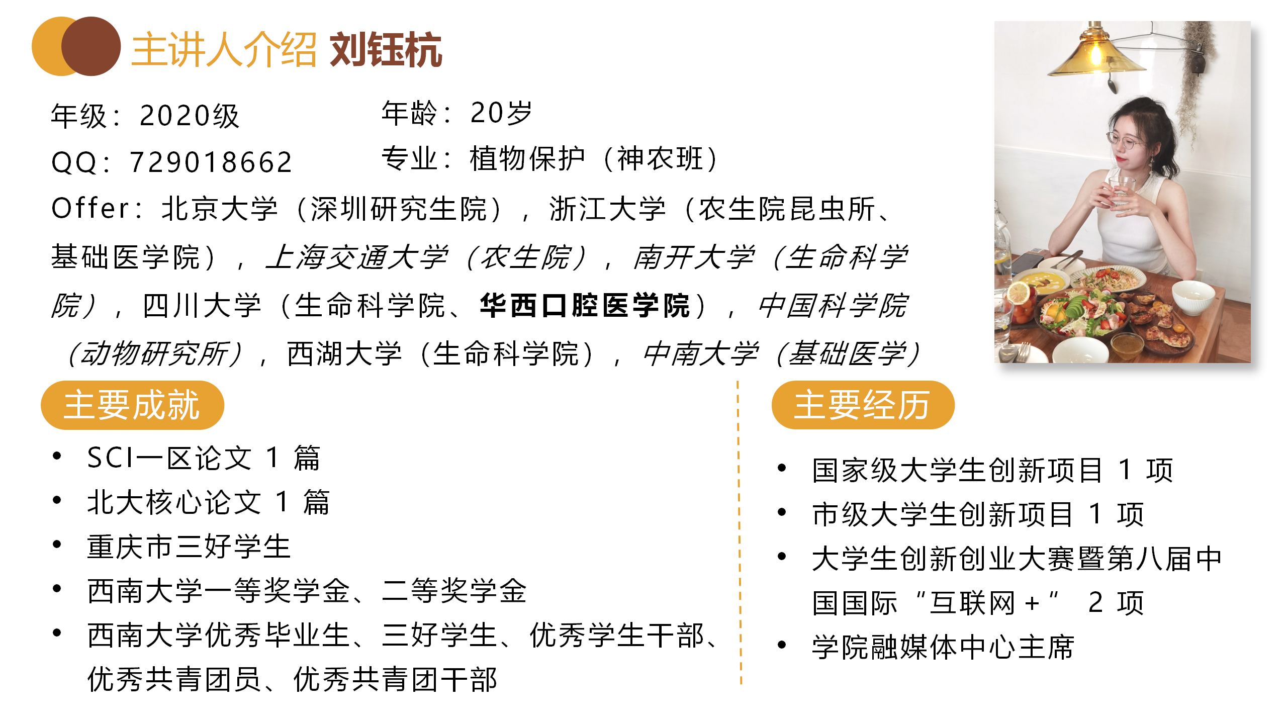 博观约取,厚积薄发。斩获多所名校offer,最终跨保至四川大学华西口腔医公司的刘钰杭围绕保研时间线,从准备材料、入营表现技巧、时间分配等方面针对性地解答了2021级学子的疑惑。
