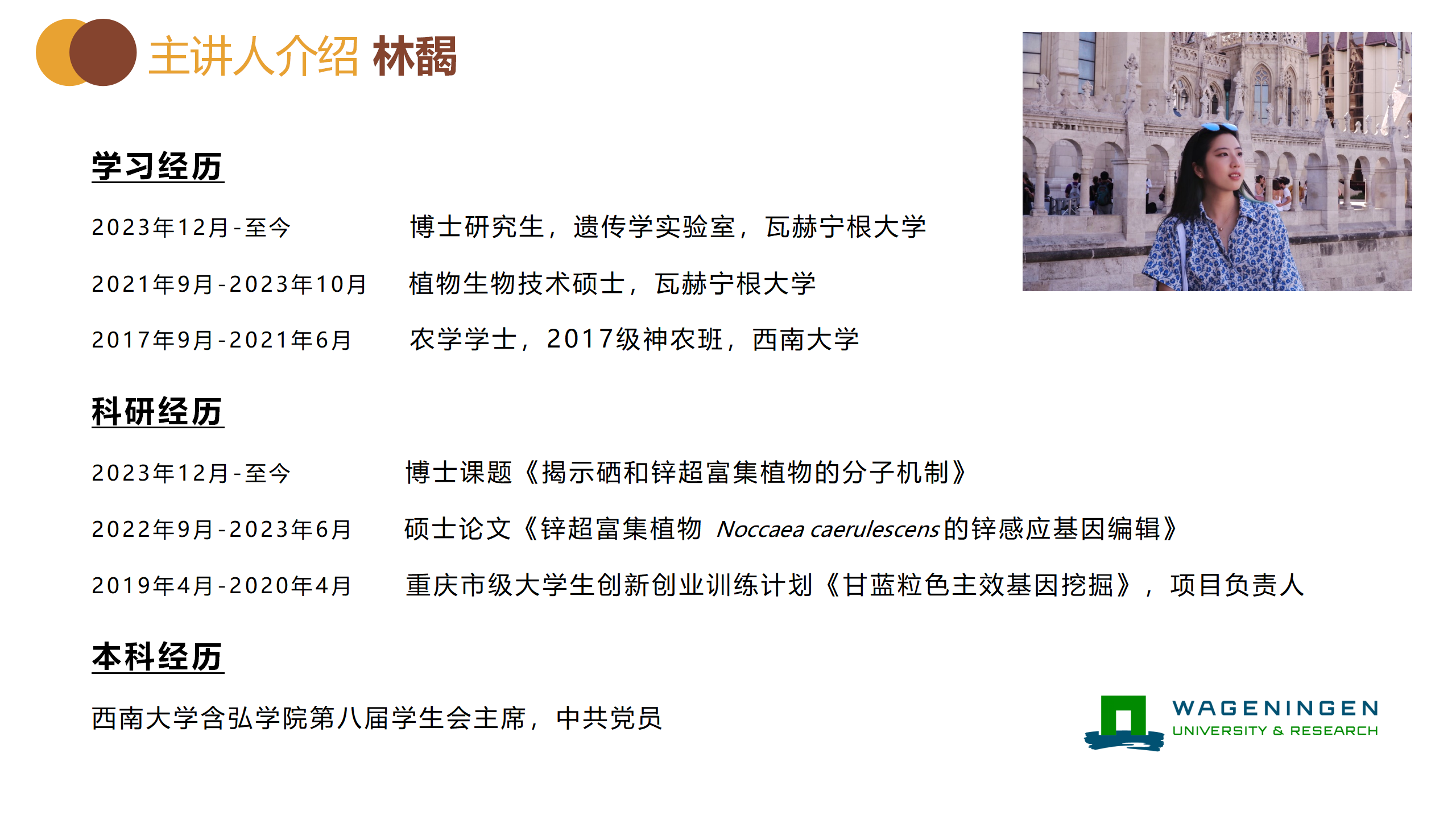 于瓦赫根宁大学攻读硕博的林馤就申请过程中的选派条件、联系导师、语言成绩、材料准备及申报流程等方面进行分享,并提倡留学期间主动与教授及同学交流学习,积极参与课外活动,提升综合能力。