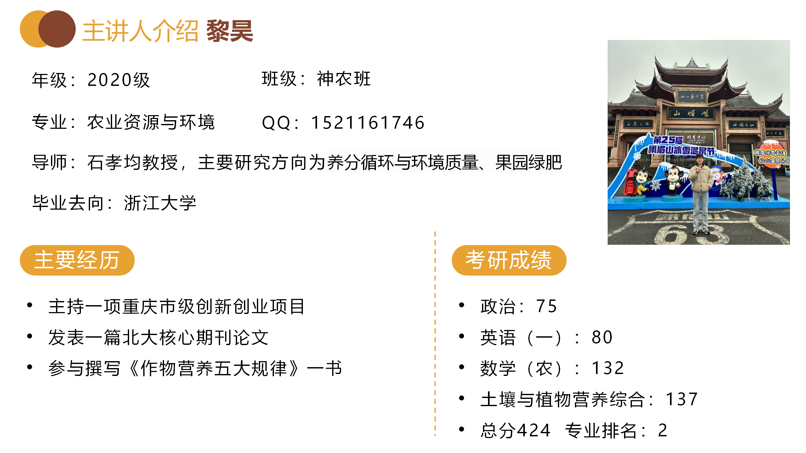 2020级神农班的黎昊以424的高分成功考研上岸浙江大学,他将保研分为初步复习期、暑假黄金期和考前冲刺期,认为分阶段制定具体的备考计划是考研上岸的关键。