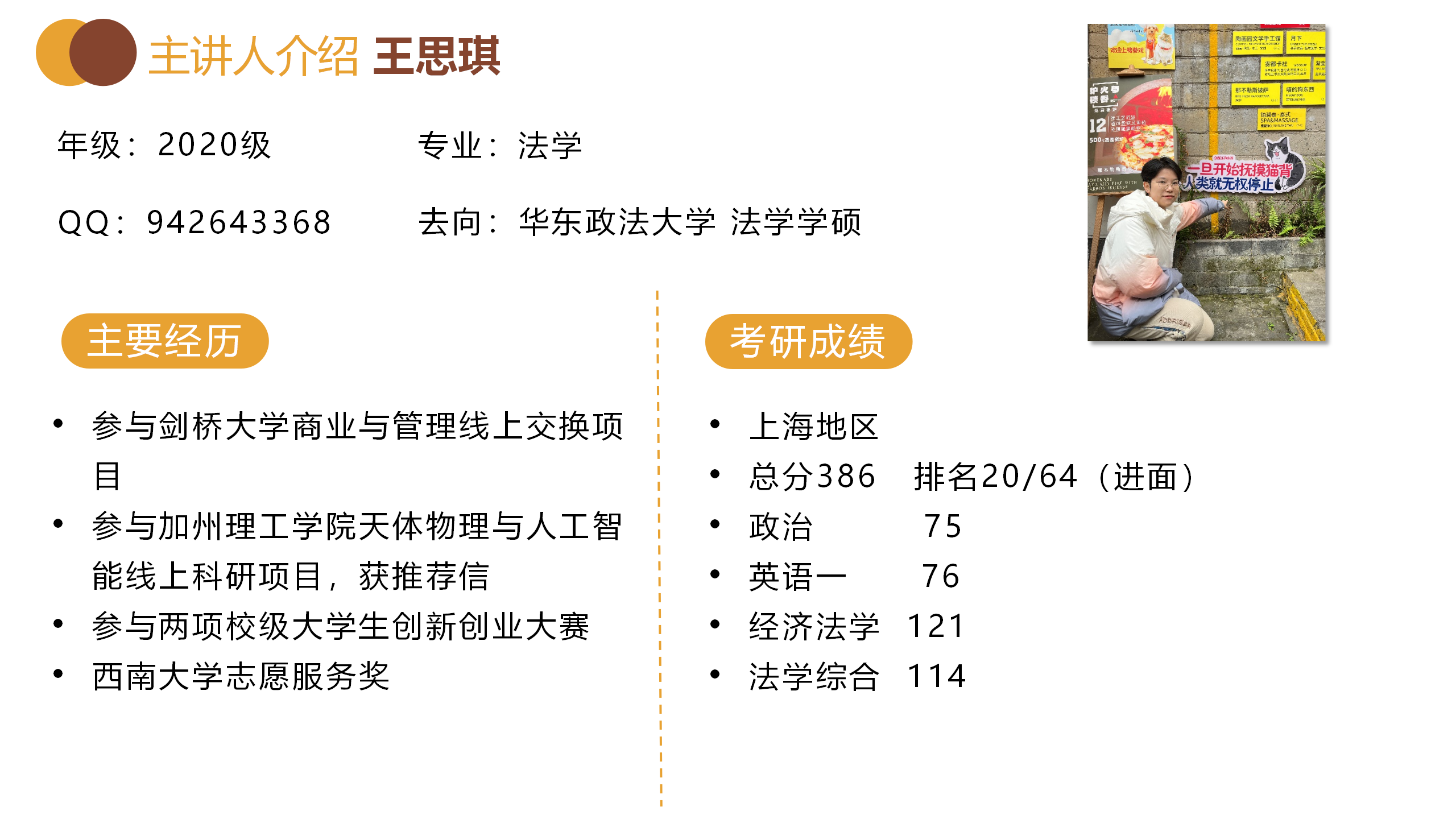 成功上岸华东政法大学的王思琪讲述了自己在备考过程中精细化刷题的方法,提示同学们要善于将知识点迁移运用到解题过程中。除此之外,她还强调要在复试的过程中展示过硬的专业实力和抗压能力。