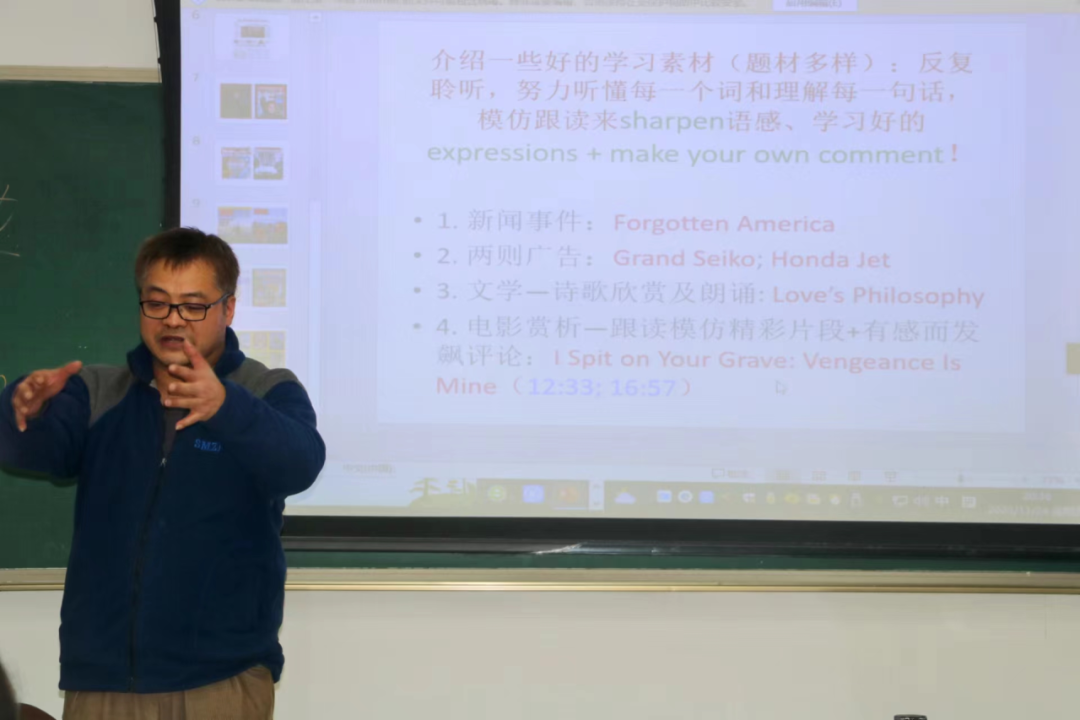 活动的第二环节,黎力准备了英语新闻、广告、诗歌、电影等多样的学习素材,带领同学们反复聆听理解、跟读模仿以加强语感和学习地道表达。