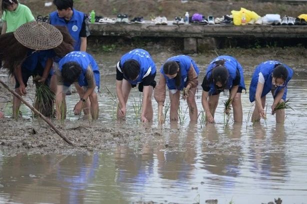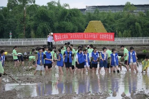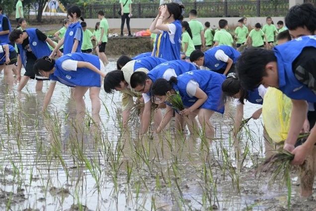 6月29日上午,同学们参与七塘镇农耕研学活动,开展田间劳动生产实践教育,深入田间地头、参与水稻插秧。村民手把手指导同学们拔秧、运秧、抛秧、插秧。同学们脱下鞋子,光着脚,俯下身子,在水田里干得热火朝天。当脚掌与稻田接触的那一刻起,那些属于传统农耕的奇妙传承就连同湿润的泥土一起裹挟着自下而上蔓延到了同学们的心中。
