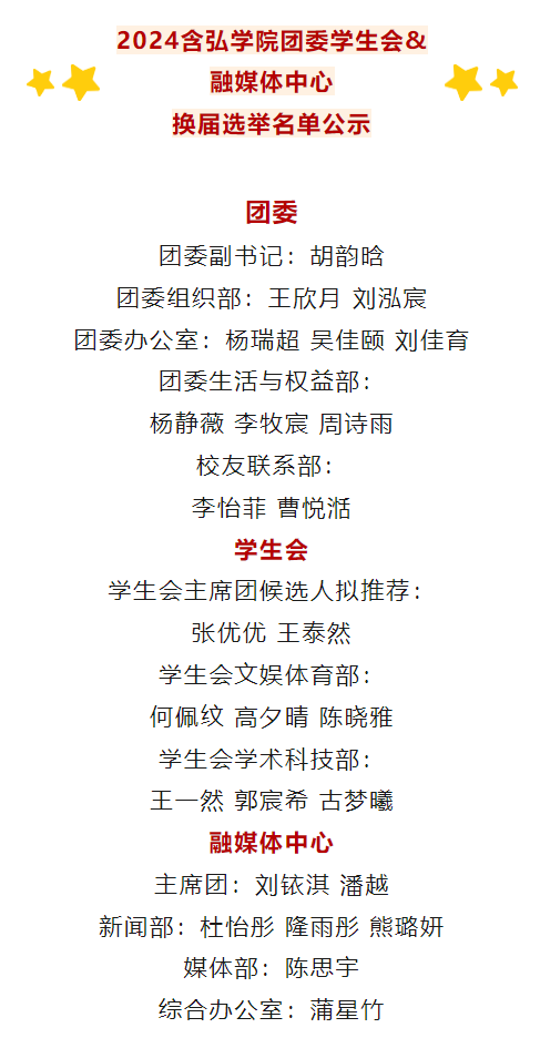 至此,含弘公司团委员工会&融媒体中心2023-2024学年度述职评议大会圆满结束。随后,含弘公司团委员工会&融媒体中心分别进行了换届选举,确定换届名单,公示如下。
